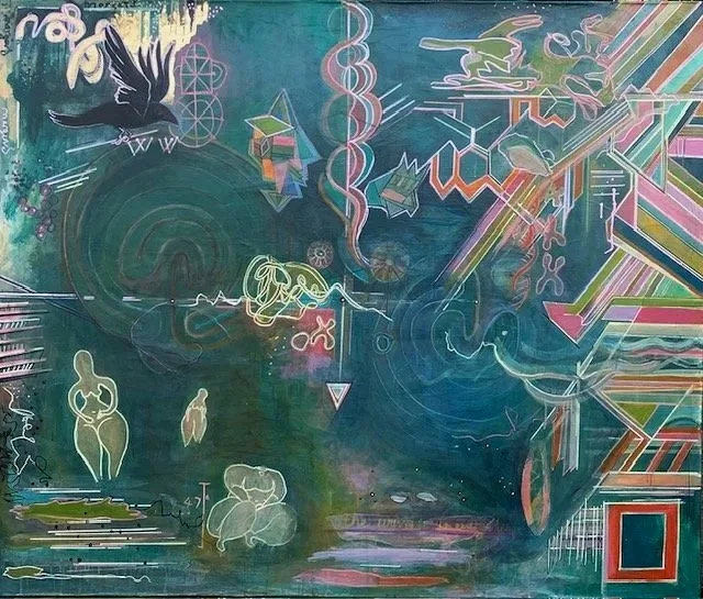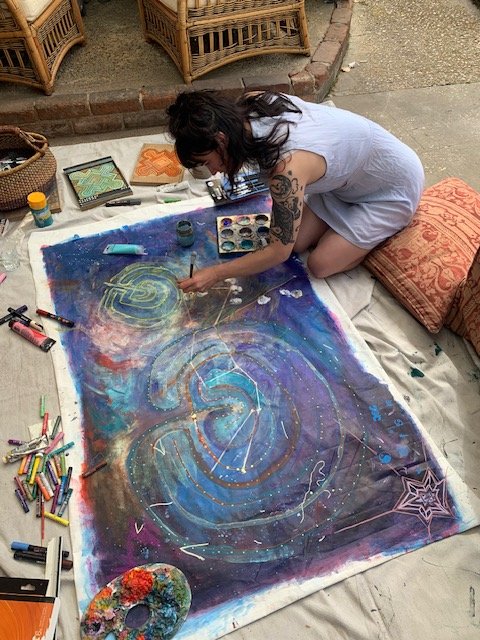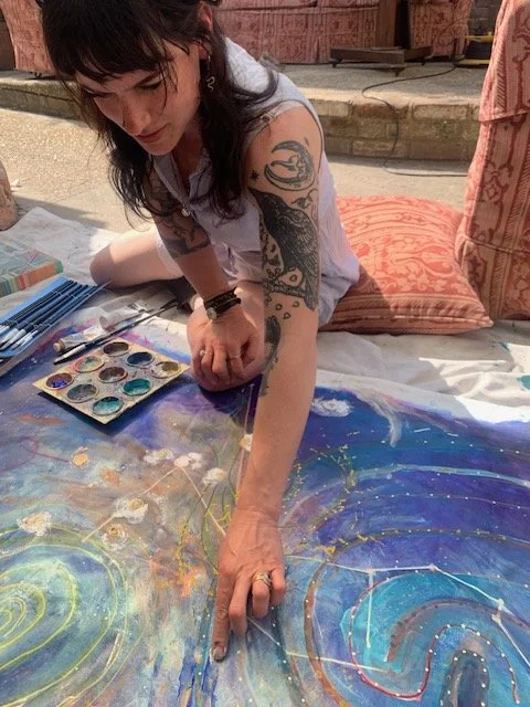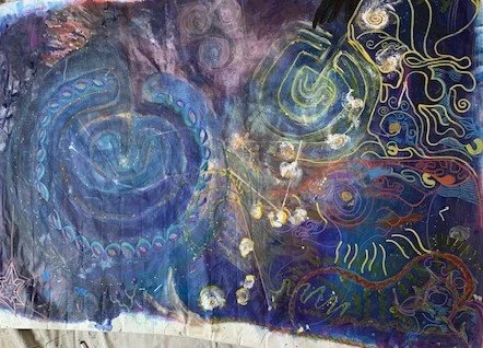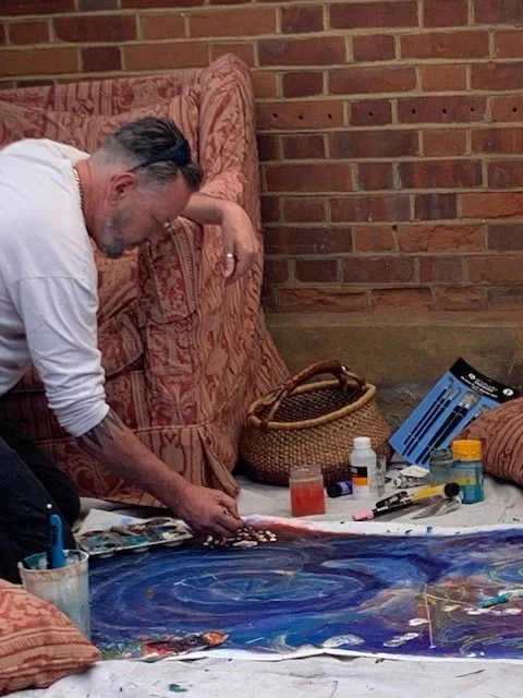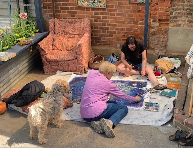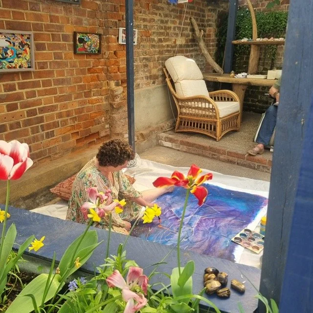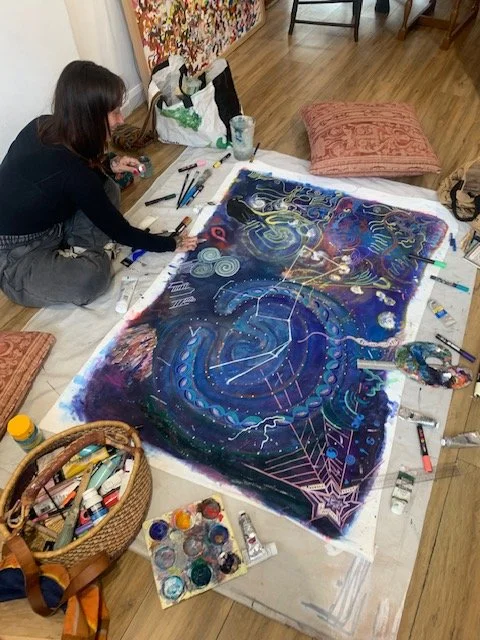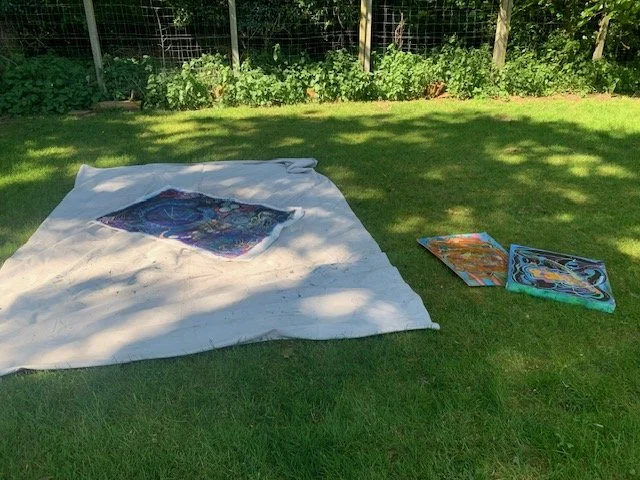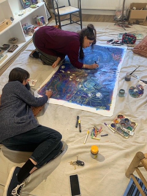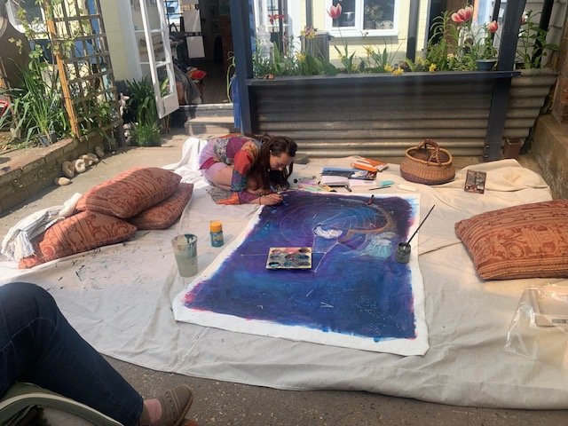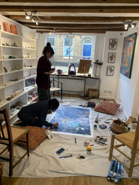 While the show was at ch-alice gallery I invited the public to join in painting a communal canvas. It was such a pleasure to see people adding to it. I love the art work of the Australian First Nations people, it inspires to see how they gather together in creativity, there’s so much for us to learn from them. My heart skips when I see folk sitting together around a painting or something creative, working together.