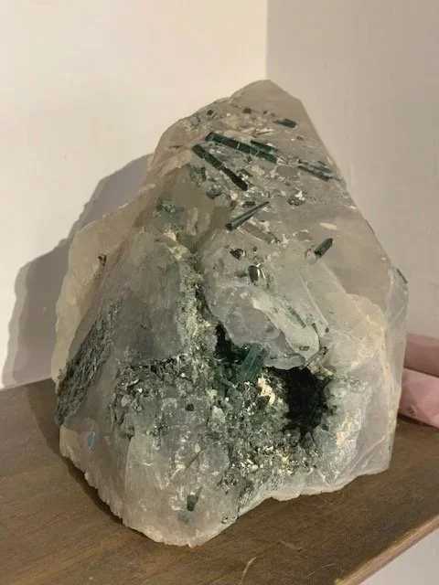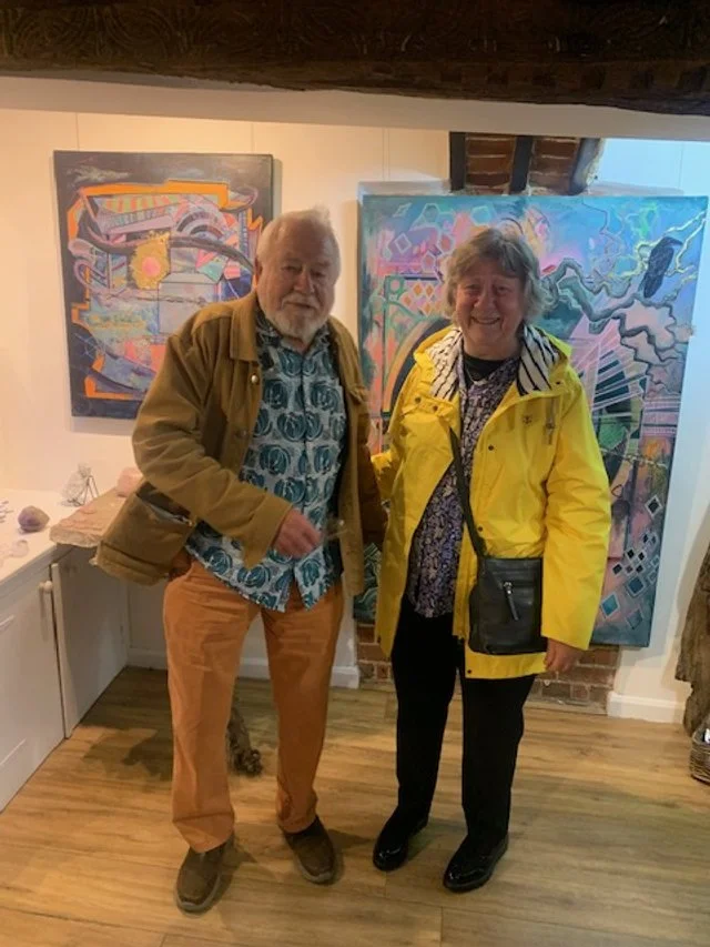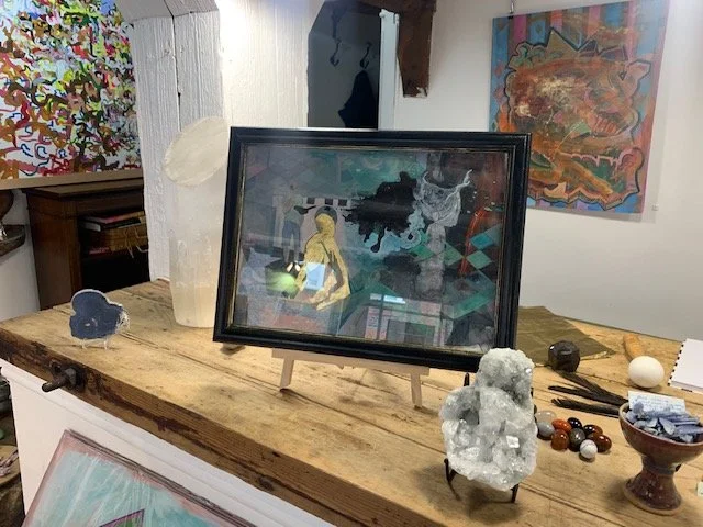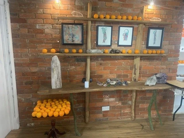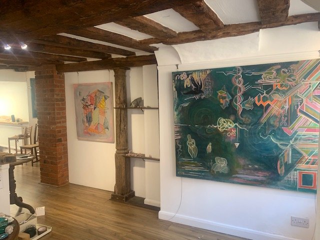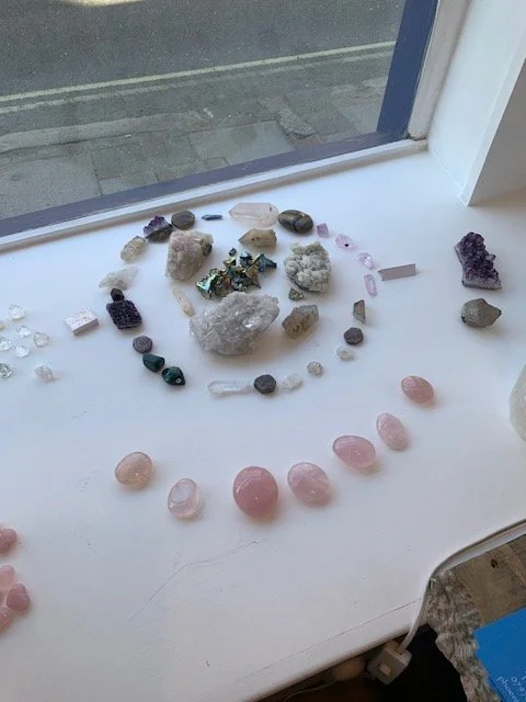 Antonia at Ch-alice Gallery, in Sudbury, uses the full moon for private views. April’s moon is called the pink moon. In 2025, the April full moon landed on the 13th. Concurrent in the shop were semi-precious stones and crystals which helped inform the choice of work presented. Some geometric drawings done in 2020 felt appropriate to sit with the stones, as well as more recent pieces.