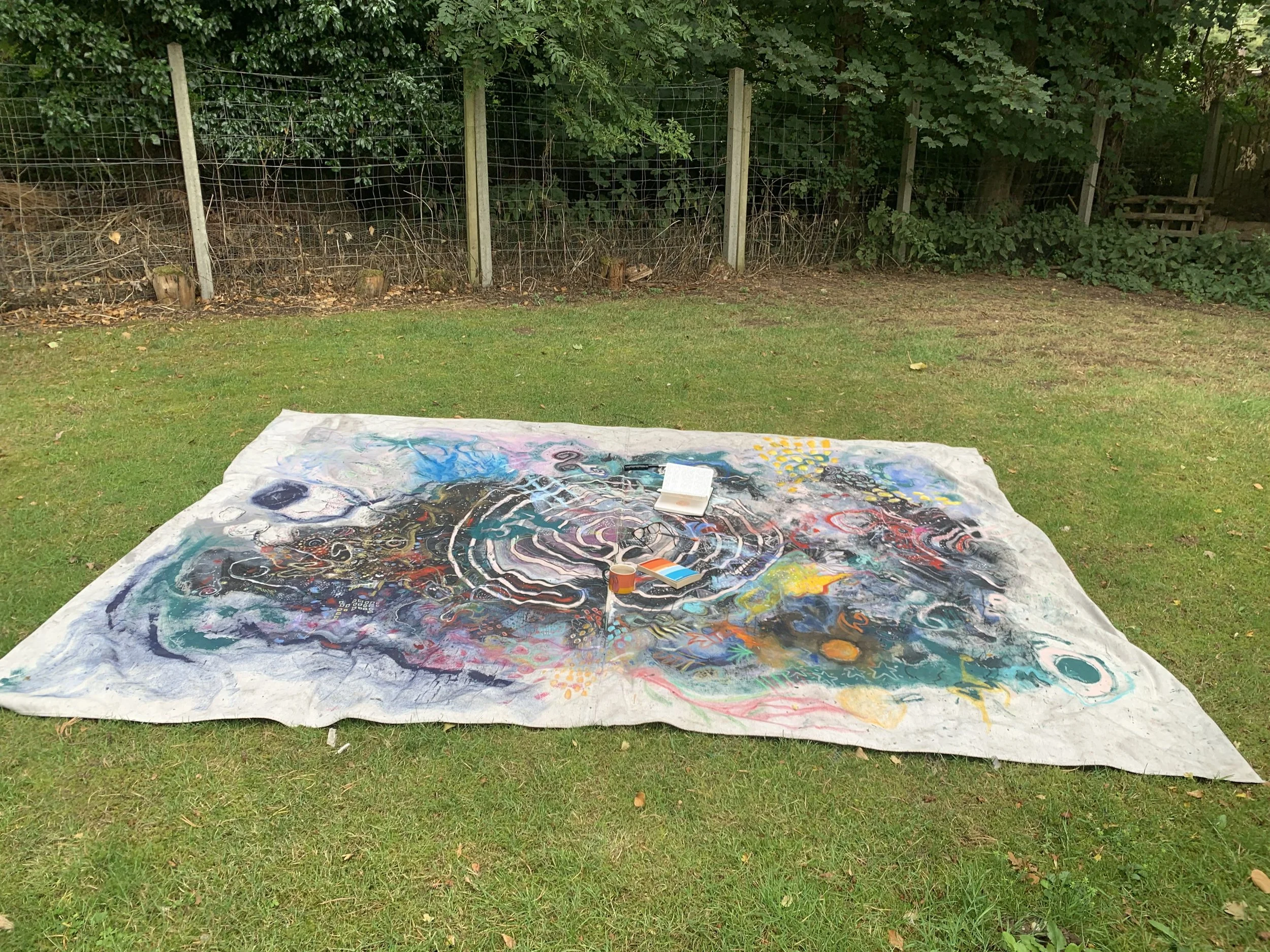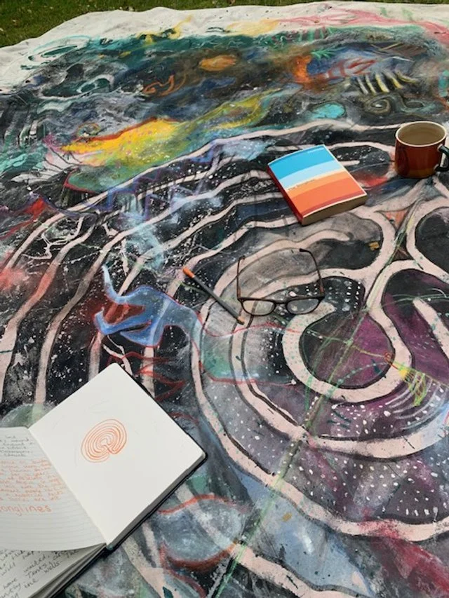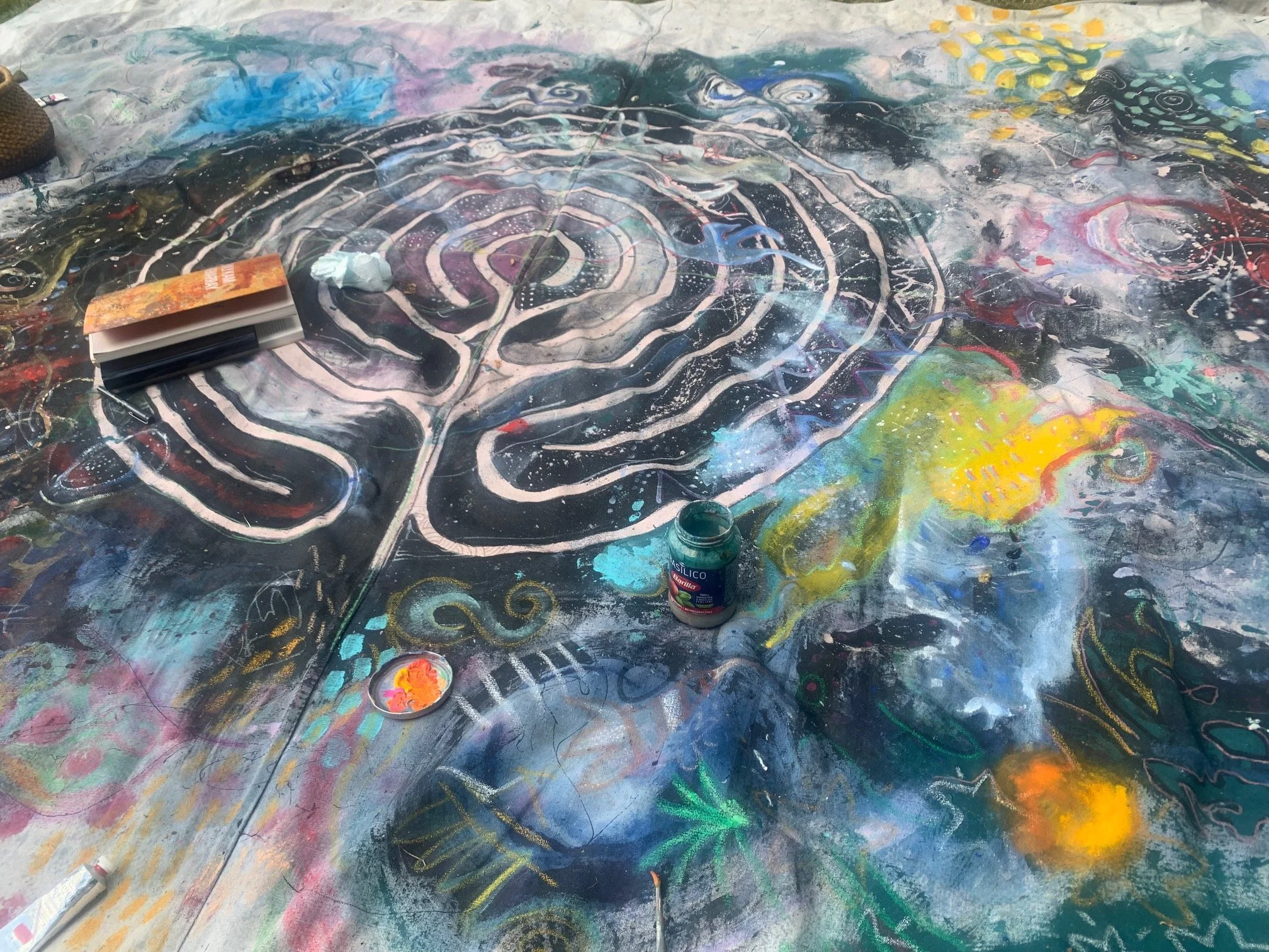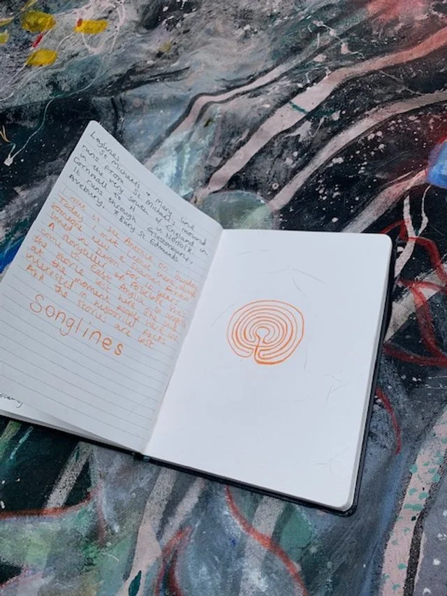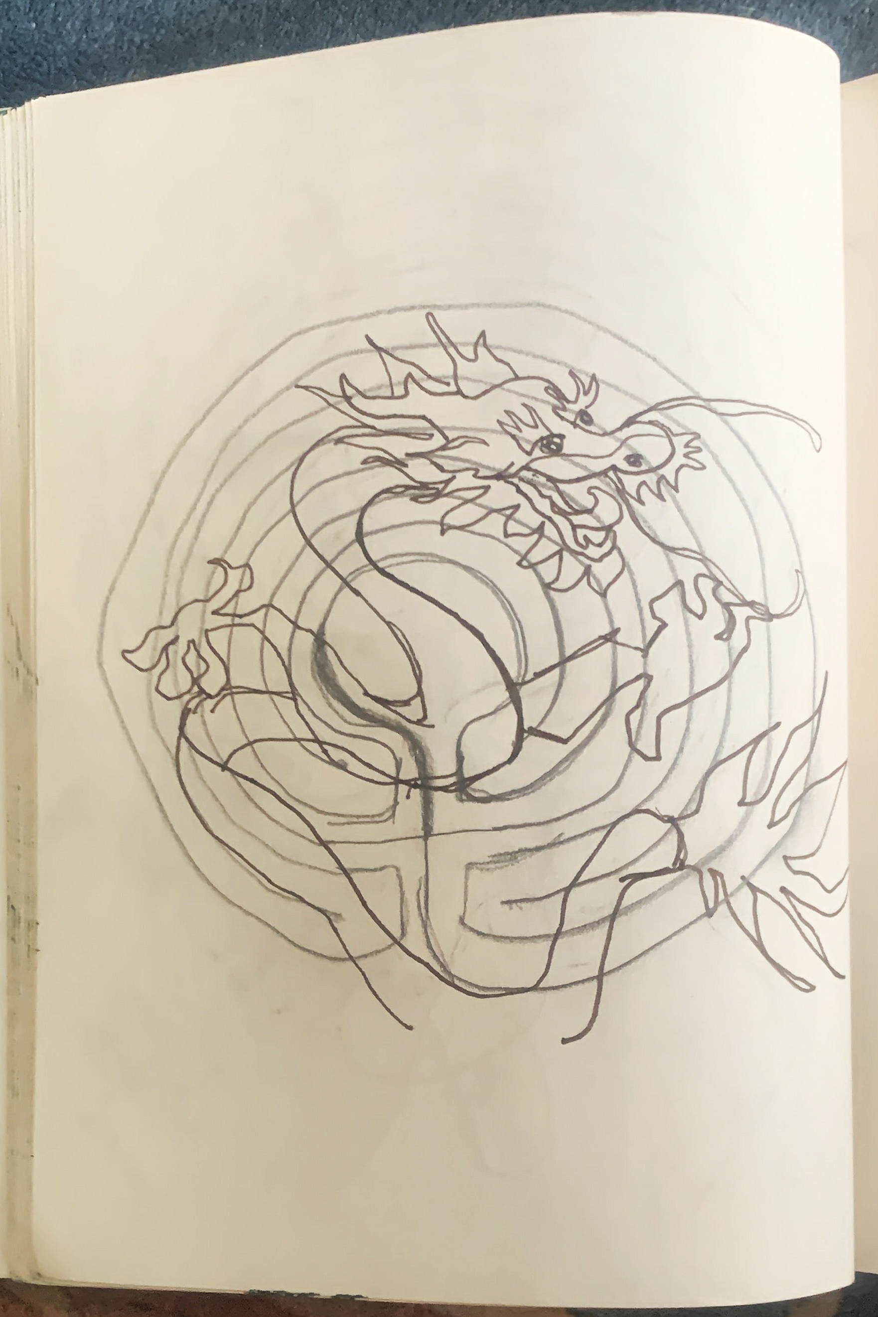 I was drawing a labyrinth in my sketchbook when I noticed on the rug before me a Chinese dragon, prompting me to add it into the labyrinth