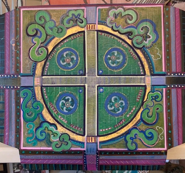 The initial drawings in the watercolour pad that I bought right before lockdown. I sat in front of the pad with a ruler, compass, pencils and acrylic paints. They were meditative, therapeutic free flowing expressions. After doing these for a while I sent some of the images off to the printers. The next stage was working painting into, and painting onto the prints. Those are the ones above.