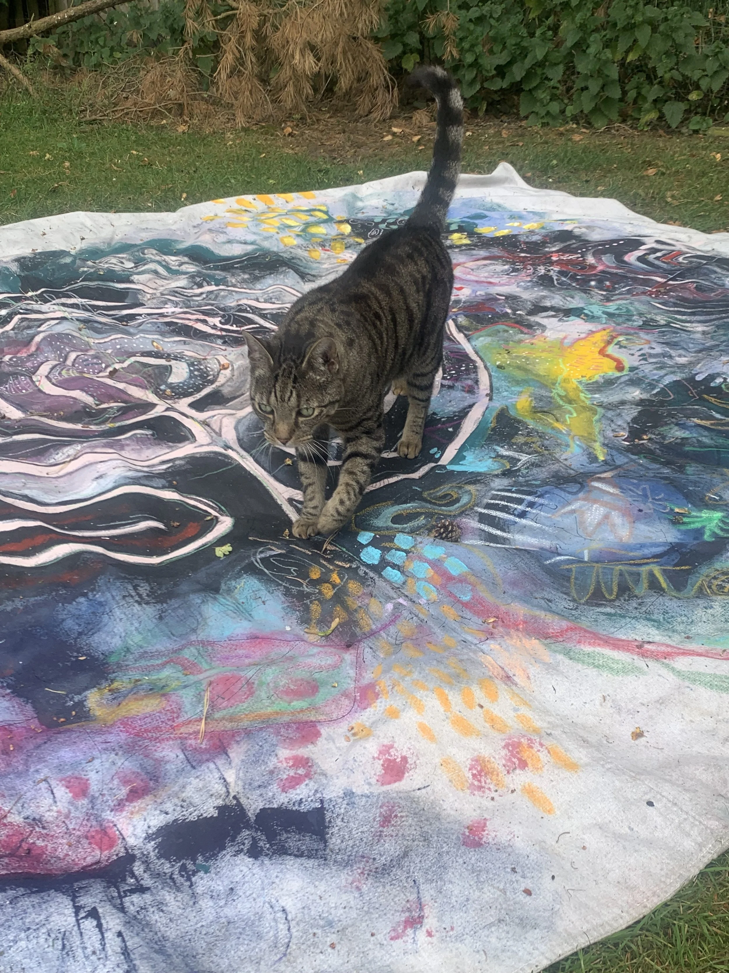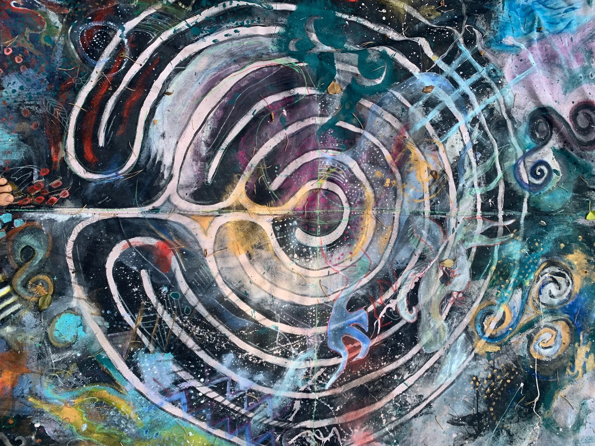I purchased the paint sheet originally to paint a walkable labyrinth on it, but it was too small. What it did become was a painting that I took alongside the travelling labyrinth, so that a communal painting could happen simultaneously to the larger one.